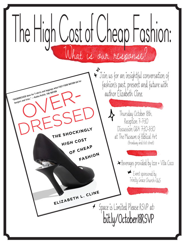 If you are in New York tomorrow please check out this event! My friend put this together (and can you tell I added a few of my watercolor strokes to the flyer!) with Author Elizabeth Cline and her new book Over-Dressed: The Shockingly high cost of cheap living.
