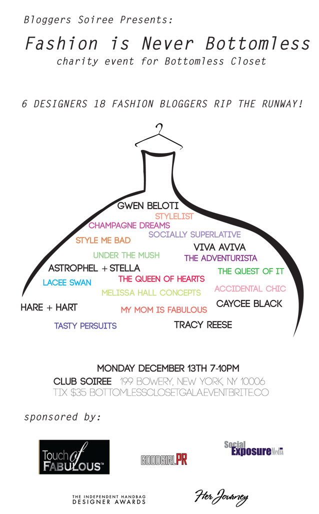 guess what??? I am part of this super exciting event taking place this Monday, December 13th! Six Designers and 18 Bloggers are gathering together to support Bottomless Closet NYC! Bottomless Closet is to help disadvantaged New York City women become self-sufficient through a comprehensive program that begins with business attire and interview preparation and continues with professional development, financial management and personal enrichment. These women then come out with self-confidence to succeed in the workforce!! If you are in NYC you should definitely come and be a part of the wonderful event! Find out more details about the designers and bloggers here! Here is the link to attend: