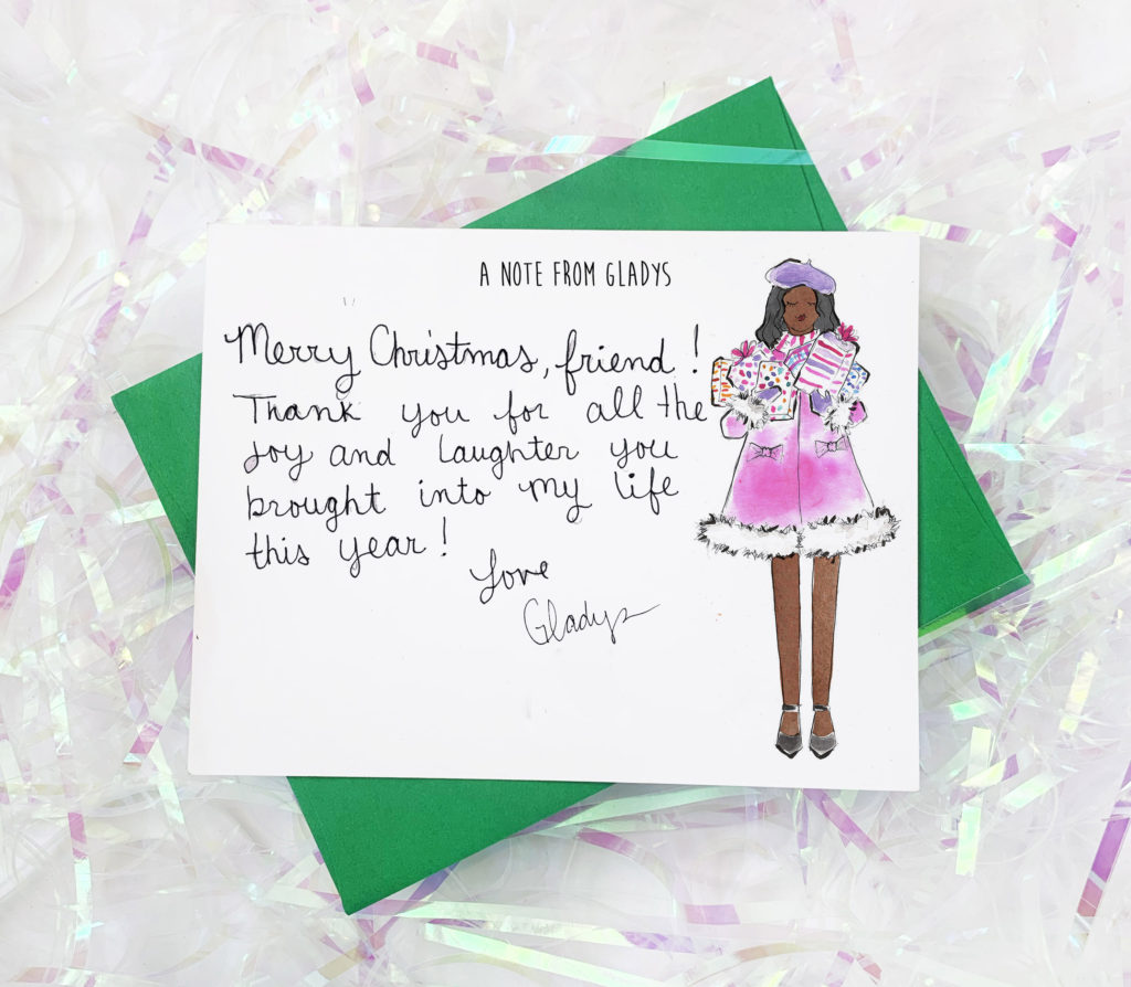 If you haven’t had a chance to check out my beautiful and stylish Holiday Cards, be sure to check them out all here! My ready to ship cards all under $25 and so many to pick from. A cute girl riding a Holiday bike to carrying Christmas decor. I also have super chic personalized note cards that you can customize with your hair color and skin tone. Check them out here! Then you can really stand out in your Holiday Card sending!!