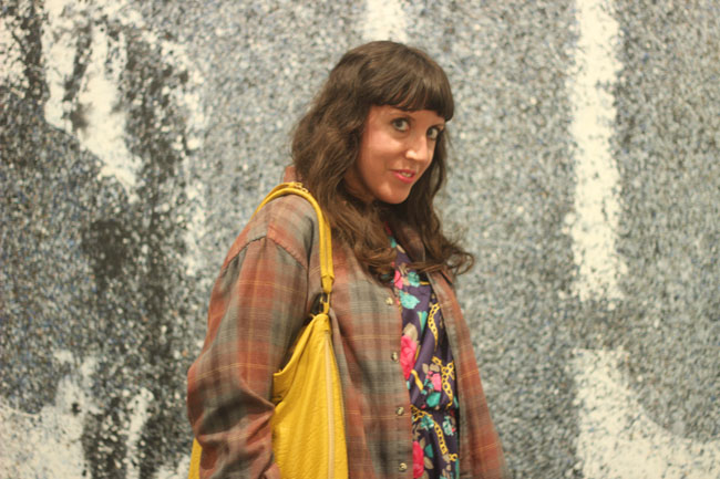 Outfit top to bottom: Flannel Shirt, and dress from Atlantis Attic, American Apparel Biker Shorts, lace socks from London, Clarks boots, bag from Century 21