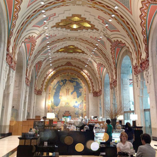 After checking into the fanciful Westin Book Cadillac, I started my adventure in Downtown Detroit. Beholding the most striking collections of Art Deco architecture, I was especially drawn to The Guardian Building which is now utilized as a retail center with a Bank of America and retail shops. In the center of this feast for the eyes, is Rowland Café. I could easily see myself coming here for business meetings, afternoon work on my blog, or a quick cappuccino before a movie date. Or, even better, late night cocktail parties. I would host one here for sure. Roaring 20s energy meets Brooklyn party girl? Yes please. If any Guardian building event organizers are reading…just saying.
