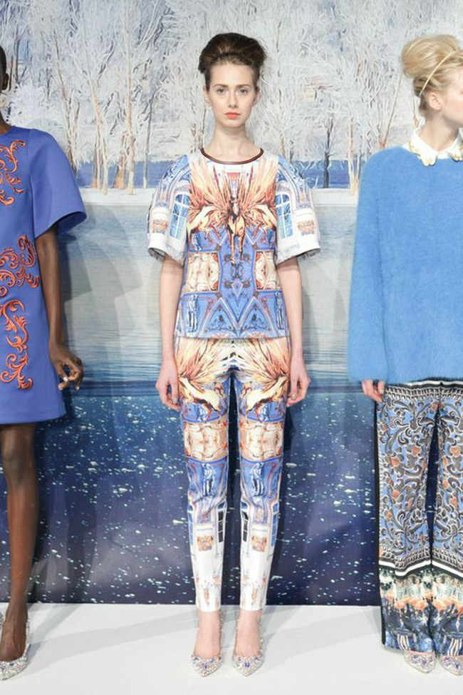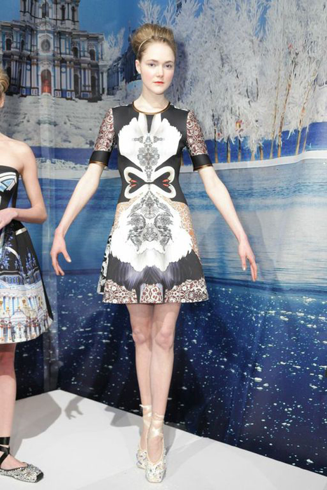 Walking into the Clover Canyon presentation was like entering a Winter Palace in Russia. Where ballerinas embraced fashion and danced around in their fancy bunheads and slippers. For Fall 2013 Clover Canyon turned homeage to Russia and inspired by excessiveness and radicalness. Russian details are seen through the collection, with influence from The Hermitage to Kazimir Malevich’s graphic Constructivism, as well as the siberian plain and Russian ballet. This was obvious as many of the models were wearing crystal embellished ballet shoes, and striking little ballet poses in them as well! I was obsessed over the voluminous beehive up-dos, a new twist for the top bun. Their trademark hand-engineered prints were suited perfectly on voluminous A-line skirts and dresses. Each outfit was heavily exposed with a theme. I fell in love with the swan one, only practical since it goes along with my name! As well as a wild horse print on a tee and pants, that was a graphical art-deco sensation. Beautiful embroideries on white crisp shirts and dresses added the magic touch. Design in LA, adds the perfect combination to a strong artistic collection, a little california free spirit. Clover Canyon is also produced here, for me who likes to support local production whenever as possible, I’d say hands up all around!