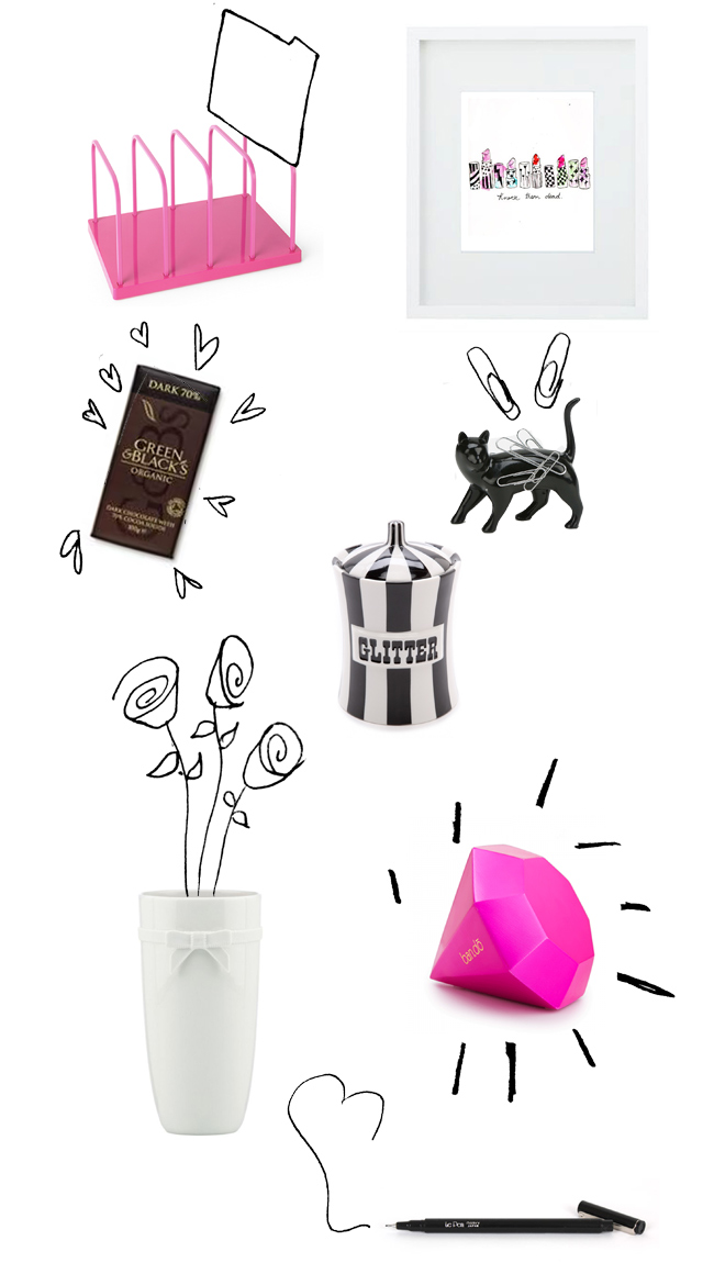 | Green & Black chocolate | Urban Outfitters cat magnet | Jonathan Adler glitter holder |