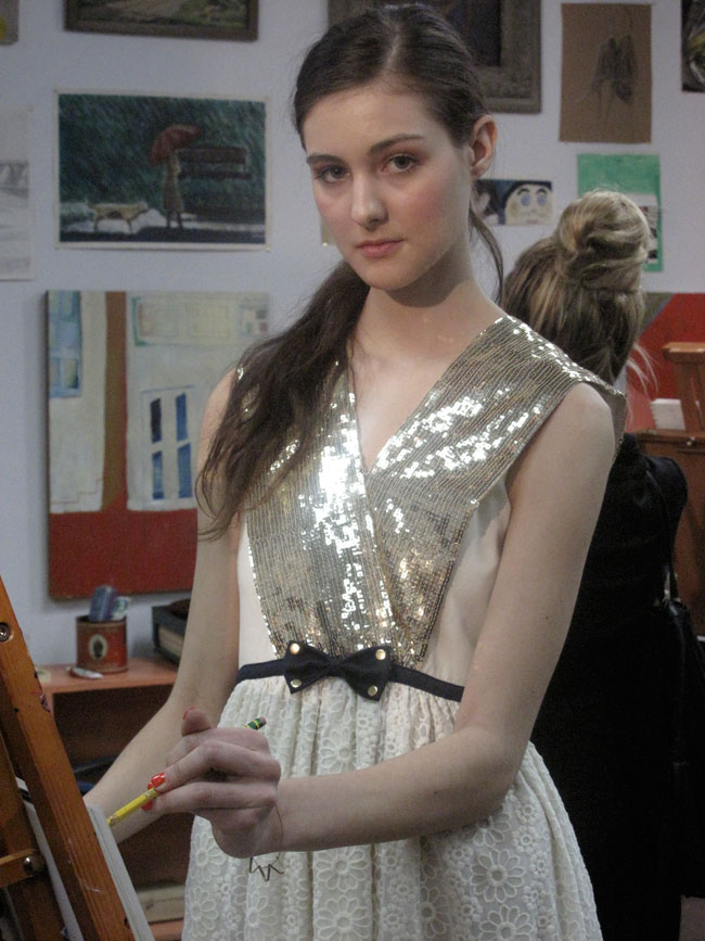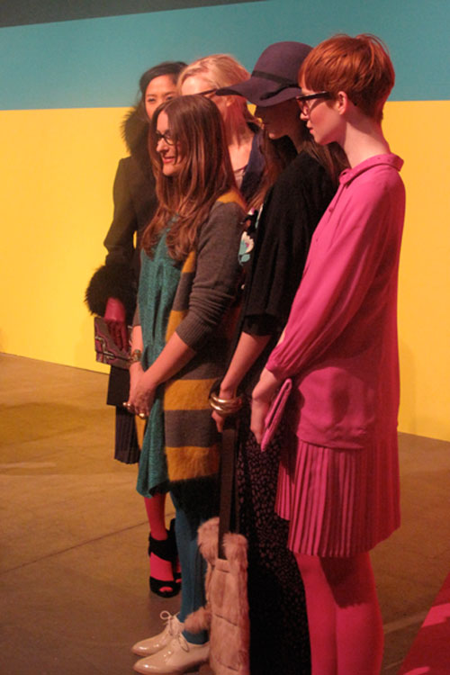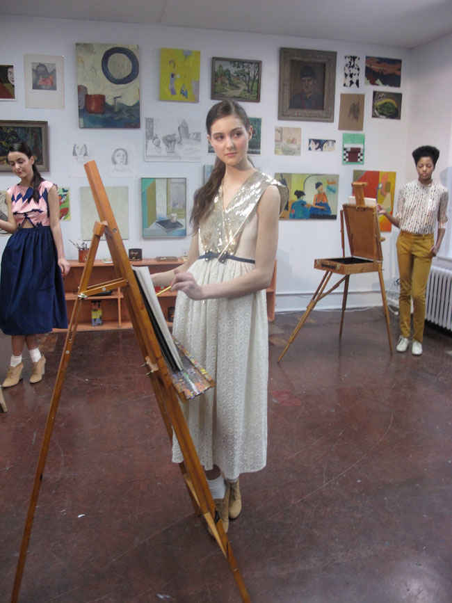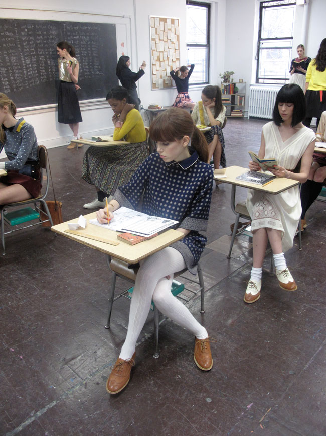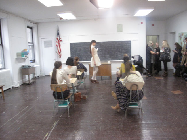 I’m a fan of when School Girl meets the Fashion world, so upon receiveing the invite to Lauren Moffatt’s Fall 2012 collection and that it would be held at the Old School in downtown New York. I knew it was going to be to my liking. The presentation was broken out to two rooms, the Classroom and the Art Room…..so naturally I strolled down to the Art Room first. Where the models were painting in their pretty girl-like outfits. Keeping true to herself Lauren’s collection was full of flirty prints, such as chevron and adorable dresses, with bows and Peter-Pan Collars!