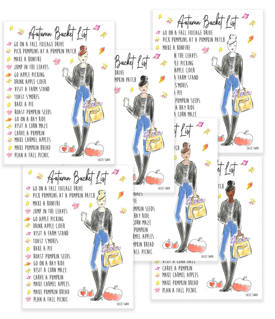 Autumn is here! Now is the time to soak up all things fall! I created this free printable download for you to celebrate the new season! Super cute decor for your office space, refrigerator, bulletin board or little gems bedroom. Sign up below to get this super cute printable in your hail color + skin tone!