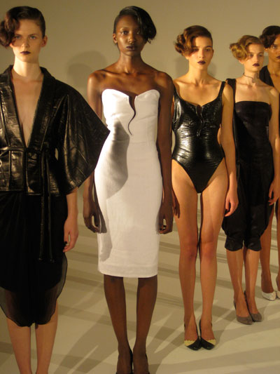 My style is rather girly, but every once in awhile I like to mix it up with something a little edgy. I love seeing what Katie Gallagher is up to, she is the ideal Downtown Girl….and I love it! Her collection for Spring 12 was a mix of only red + black (fave color combo) with a mix of soft and hard textures(another great combo) And I would really love to get a hold of some of these leggings—amazing!