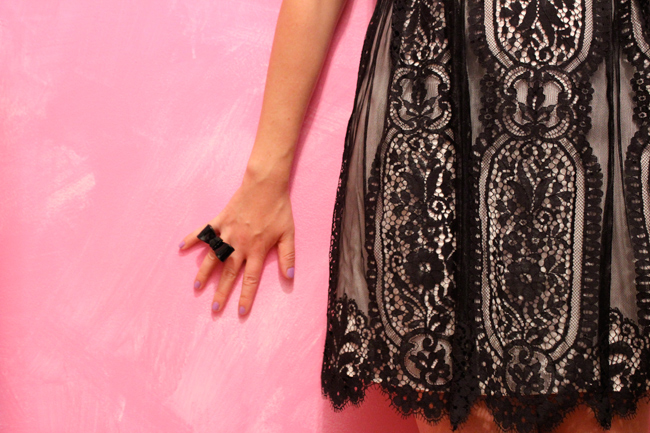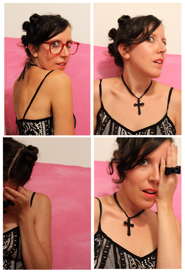 Outfit Top to Bottom: vintage red glasses from Fabulous Fanny’s, Plylones bow ring, DIY cross choker, Nanette Lepore lace dress, Nina Z. clogs