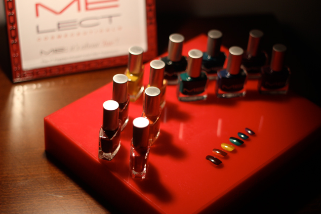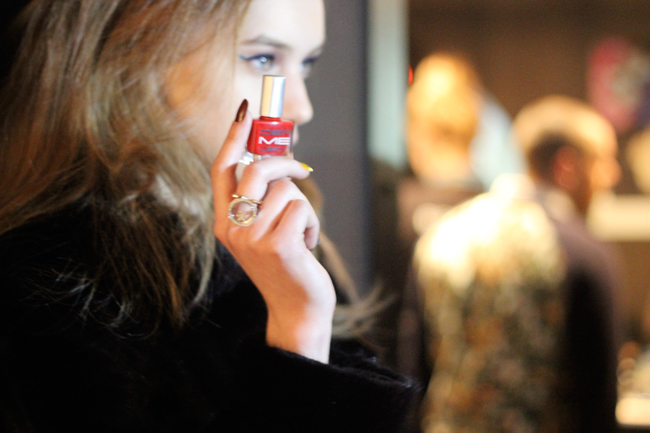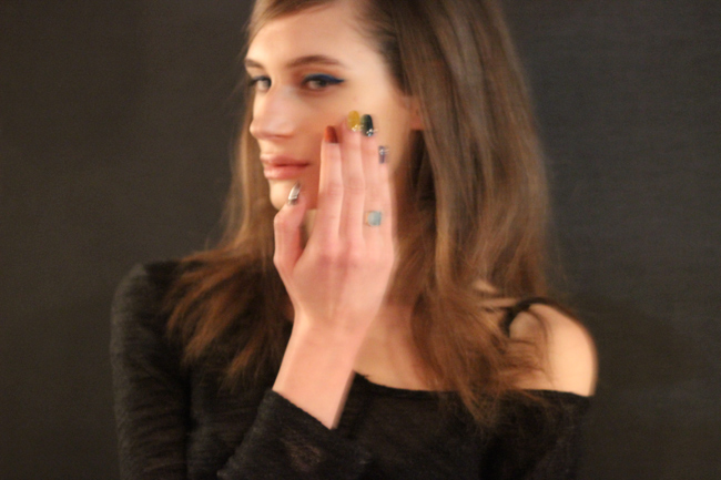 Backstage during Fashion Week I couldn’t help but be obsessed by these rainbow fun nails created by Celebrity Manicurist Elle for Dermelect ‘ME’ at the Cynthia Rowley Fall Presentation. Elle explains Cynthia’s key word for describing her inspiration of the collection was ‘moonbows’, a reflection on the romanticism of her sporty chic line for the Fall 2014 season. Elle took Cynthia’s vision and created her version of the moonbow. Representing a rainbow of darker shades not using any primary colors. For the look Elle layered two shades from the same color family on one nail, beginning with a dark red to orange, yellow, green, indigo and purple to achieve the perfect ‘moonbow’.