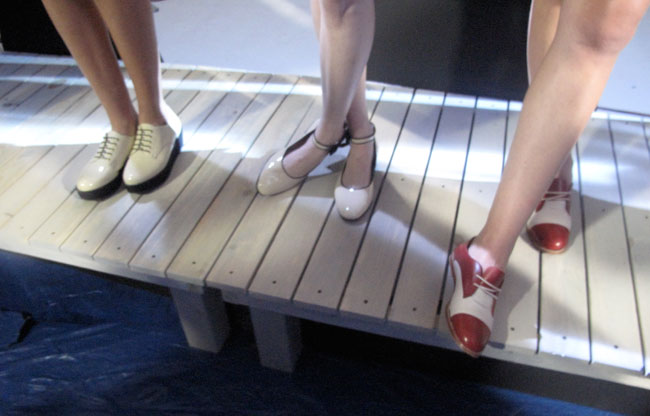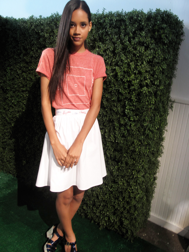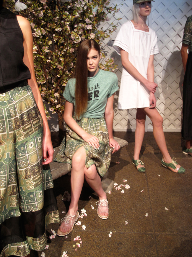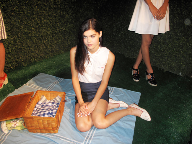 The Rachel Antonoff presentation for Spring 13 was off the racks cuteness kingdom. Like walking into a storybook Secret Garden filled with models having a picnic, eating fancy cake, playing badminton and all other sorts of whimsy fun. The models were wearing a lot of feminine and sporty silhouettes. Tennis inspired skirts and dresses that were fitted and flared. The seersucker fabrics definitely gave it that preppy flare on a sun-filled spring day. A super cute tee that says “I am With Her”. Yes please. A lot of red, white and blue colors filled the room feeling very patriotic. Red and white stripes paired with blue and white stripes for a mis-matchy but totally matchy feel. I adored all the hand embroidered of names in red and blue that decorated the tennis shoes + sweatshirts. Antonoff used the first names of the girls that inspired her like Lena Dunham and Hailee Steinfield. Giving it the “cool girl club” vibe. The Bass Hearts RA shoes were “I must have all” collection. With jelly style sandals, and also jelly style oxfords…I give it a 10!