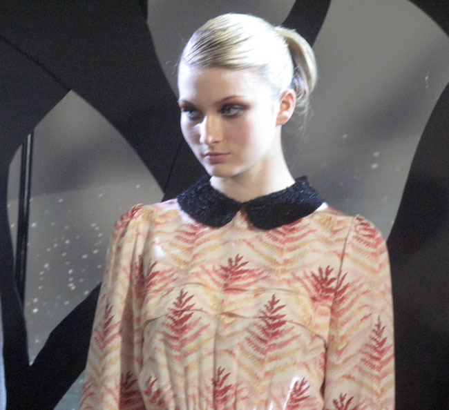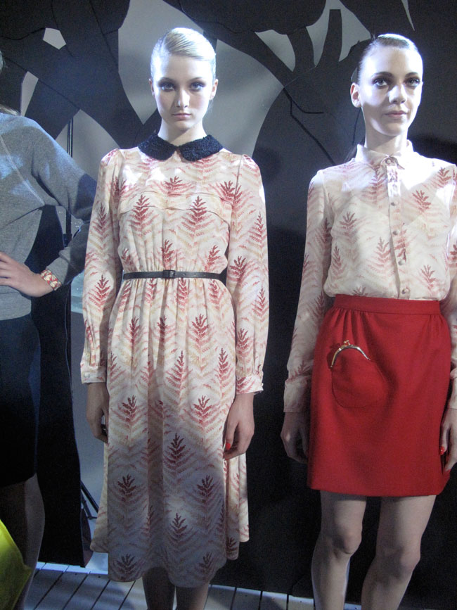 Getting excited for fall and escaping into storybook land with Rachel Antonoff. For her Fall 12 collection she brings back a childhood memory of pretending to be sailing at night. And she takes us back to this imaginative tale very well with her whimsical clothes. No surprise here, in a very good way. Girlish dresses embellished with sparkling collars. Prints reflected a delightful trip sailing along a forest of printed leaves. And how adorable is this little skirt with a coin purse sewn to be a pocket! That is definitely going on my wish list! Colors included fire engine red, delicate oranges, deep blues and a dark turquoise. Silhouettes were of high waisted skirts, playful rompers, 40’s feminine fitted tea-length dresses, along with embellished shifts. Hoping to get my hands on some of these this fall, so cute!!