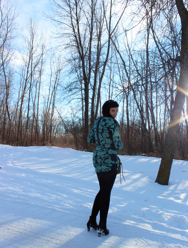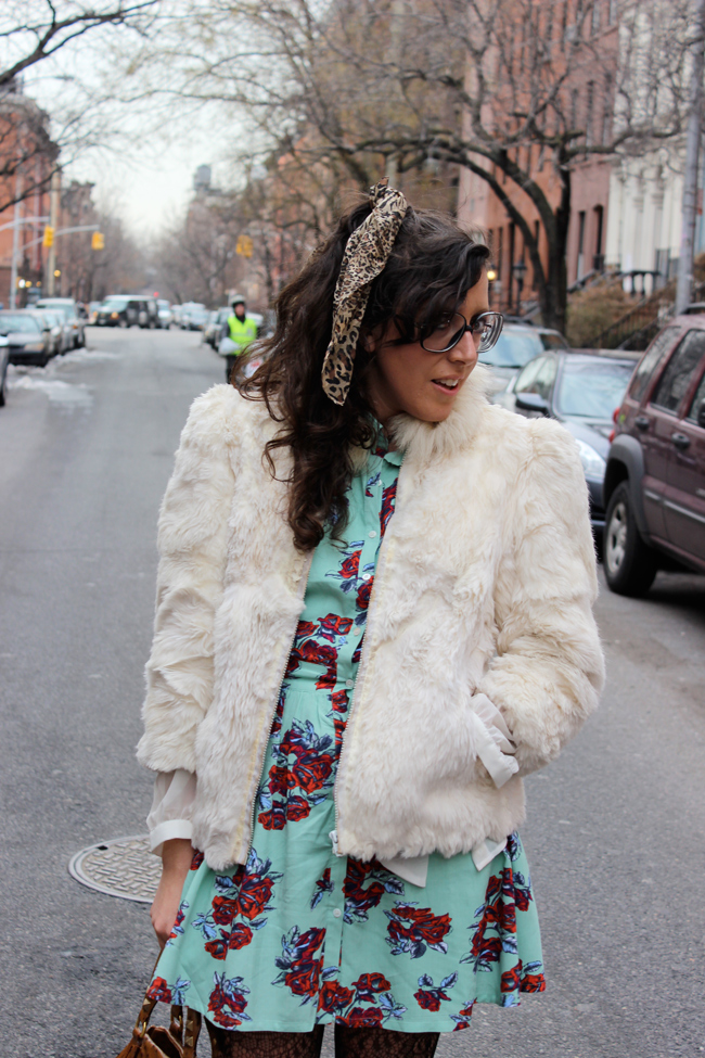 Outfit top to bottom: vintage Fur Coat from Atlantis Thrift Store, thrifted floral dress from Beacon’s Closet, handbag Rebecca Minkoff, boot from Century 21