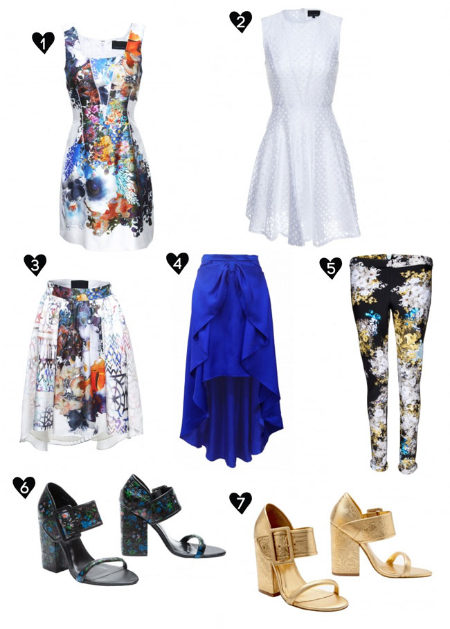 I have an obsession with all these pretty pieces from Cynthia Rowley in her Spring/Summer 2012. An Art Girl herself, Rowley always has a good dose of contemporary art mixed in her designs. So of course I am a big fan. Abstract botanical prints mixed with geographical lines, all very much future meets classic. Ah hourglass white dress in a mesh-like sport fabric and athletic seaming. I can easily imagine twirling in these dresses but looking mad cool all at once. Flowy, billowy skirts with bows, and painted like lyrca leggings. Oh, and then some-chunk + strappy heels to the mix, yes atta girl Cynthia!