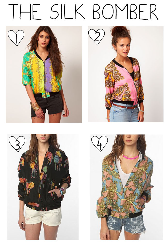 Or more like this silk bomber jacket she is wearing. A few summers ago I purchased this animal silk bomber at Beacons Closet. Which I have gotten the most wear of this summer, all of a sudden it is in style. Isn’t that how it goes. I would love to have a mixed floral one like below. I am very surprised that I have not seen more out in the market. They are the perfect summer jacket wether to wear over a body-con dress or to spice up a pair old blue jeans.