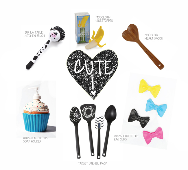 | Sur La Table Kitchen Brush | Modcloth Wine Stopper | Modcloth Heart Spoon |