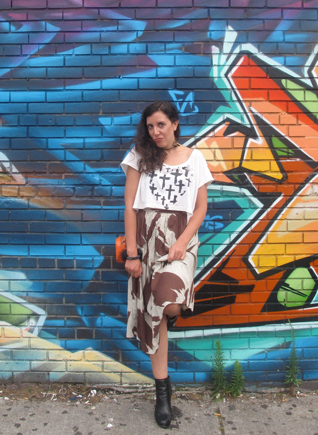 {outfit: DIY choker, Lacee Swan Tee, Thrifted Skirt, thrifted purse, Frye Boots}